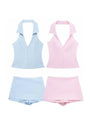 The Lexie Two Piece Set pairs a fitted crop top with a matching skort for an easy coordinated look. The top features a V neckline and functional front zipper, while the high rise skort delivers the appearance of a mini skirt with the coverage of shorts. Cut from a stretch woven blend, the set lies smoothly against the body and maintains comfort throughout the day.