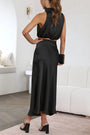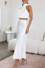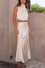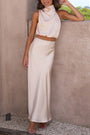 The Talia Two-Piece Evening Set is designed with a refined silhouette and sleek structure. The cropped high-neck halter top features soft draping with a clean back closure, while the matching ankle-length skirt offers a fluid, elongating line through a subtle bias cut.